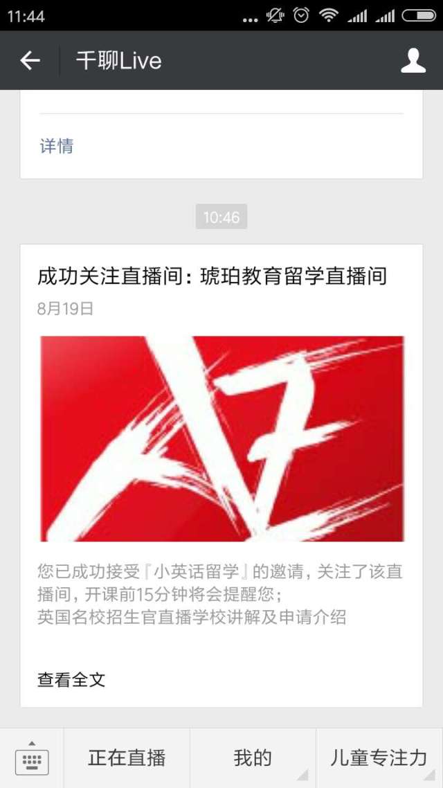 后台自动跳出琥珀教育的直播间,点击进入