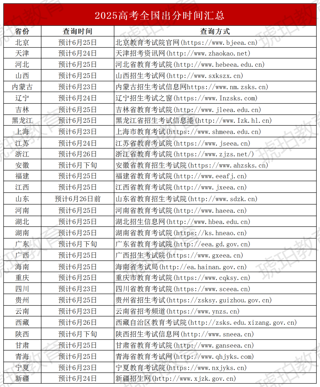 从今天起,全国各地2025高考成绩开始陆续公布。琥珀教育帮大家整理汇总了全国多地的高考出分时间,快来一起看看吧!