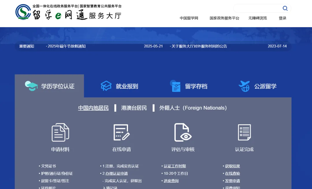 PART 03 留学生回国建档流程 01 完成中留服学位学历认证 图源 | 教育部留学服务中心