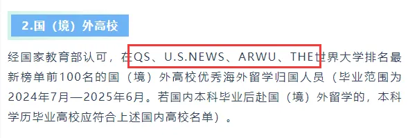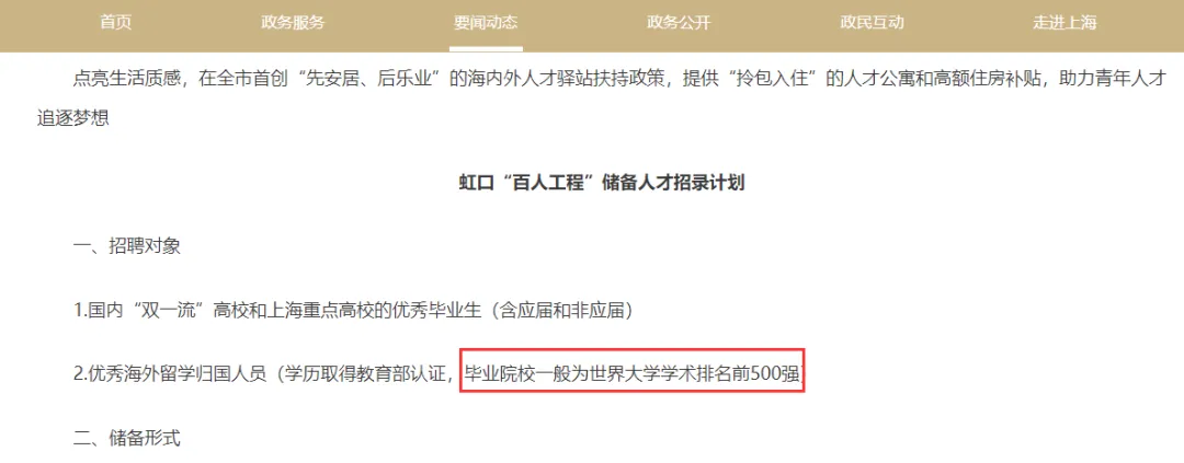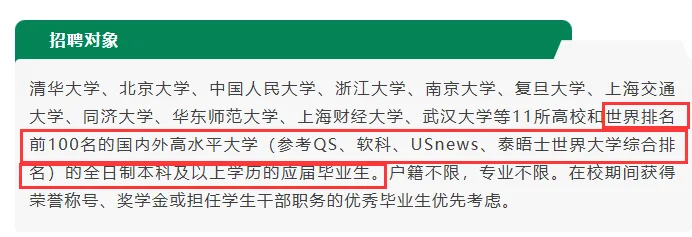 长宁区 图源:网络 招聘人数:计划招聘20人。 招聘对象:QS世界大学排名最新榜单前100名,2025年7月前毕业的应届留学生。 薪资待遇:博士年薪约20.4万元、硕士年薪约19.4万元,本科生年薪约18.4万元。 储备人才的选拔竞争相对较小,符合要求的留学生可以大胆一试。 PART 02 关于排名的说明 同学们需要看清楚各区对于世界排名Top100的定义: 静安区:QS、US.NEWS、ARWU、THE世界大学排名Top100 ▪ 虹口区:没有明确说明,但是前500名,范围极广(估计四大世界大学排名都认) ▪ 徐汇区:QS世界大学排名Top100 ▪ 黄浦区:QS、US.NEWS、ARWU、THE世界大学排名Top100 ▪ 长宁区:QS世界大学排名Top100 静安区和黄浦区对于四大世界大学排名都认,而徐汇区和长宁区仅认QS,虹口区则没有明说哪个世界大学排名,但是范围比较广。 最新世界大学排名参考: 炸裂!2026QS世界大学排名公布!香港大学飙升至世界第11!谢菲重回世界一百强! 颠覆QS!2026年U.S. News世界大学排名发布!英国96校上榜,港三又变了? 重磅!25年第一个排名发布:THE世界大学学科排名发布!英国院校多个世界第一! 2024软科世界大学学术排名出炉!港校稳中有升,澳洲大学“崩盘”?北京选调只认它? PART 03 留学生上海落户政策 不符合储备人才招录要求的留学生也不必担心,想留在魔都,不止体制内这一条路。 况且,上海的落户政策对于外地的留学生来说简直是第二个老家~~!! Top50:直接落户(无社保基数要求,无累计时长要求) Top51-100:6个月社保(无社保基数要求) 双一流本科或高水平硕士;境外本科+硕士;高水平本科:6个月社保+1倍社保基数(11396) 非双一流且非高水平:12个月社保+1.5倍社保基数(17094) 创业落户:注资50万+6个月社保,不看基数