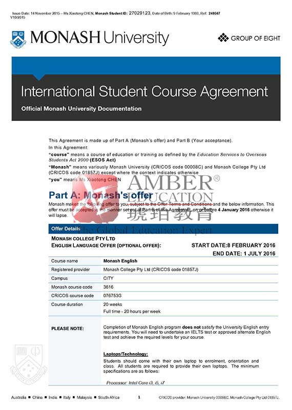陈同学申请学校时是一名大四下学期的在读学生,申请澳洲院校同年7月开学期,本科阶段学习的是金融专业,并且成绩优异。同时申请了包括莫纳什、澳国立、墨尔本、阿德莱德、昆士兰这五所知名学府,除了墨尔本大学之外,均获得了院校的录取通知书。经过多方面考虑,学生最终选择了莫纳什大学(会计&金融专业位列全球第20位)作为其深造之院校。但是,由于该生的雅思成绩没有达到专业课的录取要求---雅思6.5(6.0),最后以雅思5.5(4.5)的成绩申请到20周的语言课程+专业课的Package Offer.于次年的2月开始语言学习,学生在进入专业课学习之前需要再次参加雅思考试,并且达到专业课的语言成绩才能顺利转入专业课的学习。