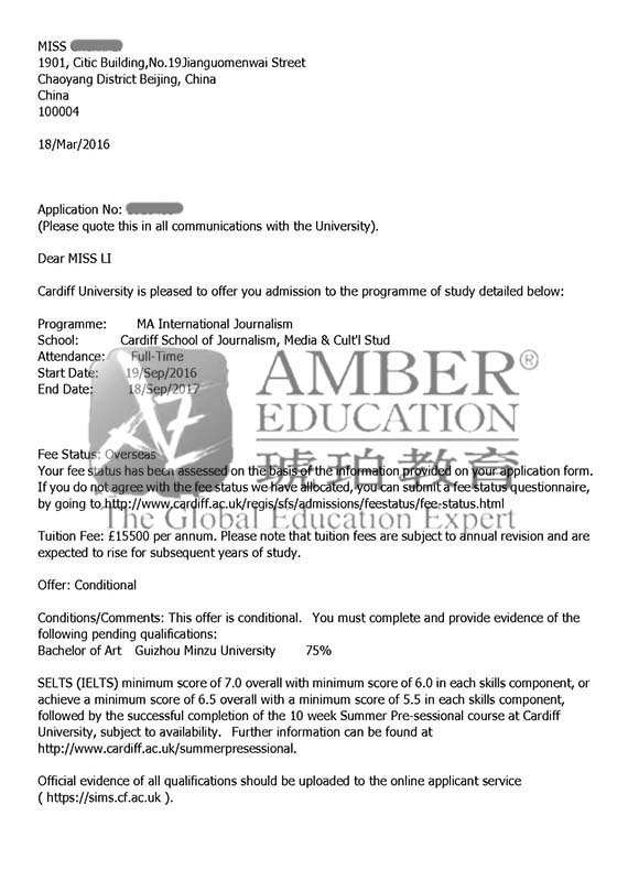 申请期间也是比较坎坷的。虽然文书准备毫无雅思,但是学校后期跟进遇到了很多坎坷,尤其是卡迪夫大学。因为大学那边的回复效率以及邮箱问题,文案老师跟卡迪夫大学邮件往来不下10次。文案老师邮件与电话并举,及时并合理跟进申请,最终成功的帮学生拿到了卡迪夫的offer。