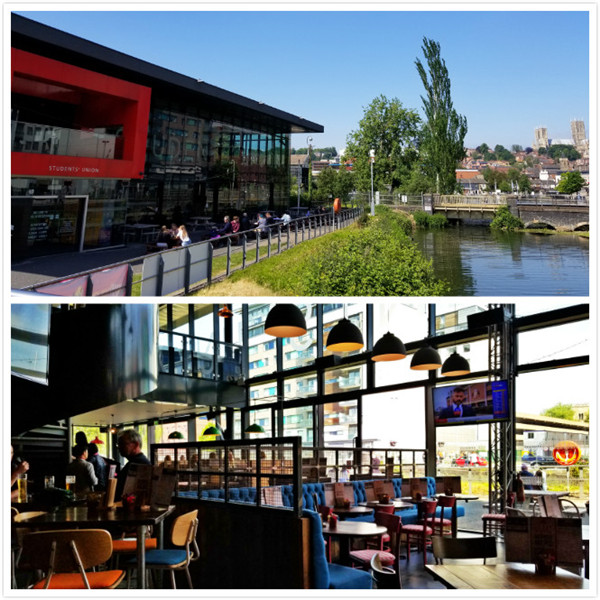 值得一提的是学联,student’s union,这也是每个英国大学的特色,不同于国内的大学,英国大学的学联会组织丰富多彩的活动,学生参与度非常高,是学生们社交的最佳去处。林肯大学的学联非常漂亮,坐落在河边,里面有咖啡厅兼酒吧,下午时分,些许学生边享用下午茶边聊天,在林肯大学有一百三十多个社团,为来自不同国家、不同兴趣爱好的同学们提供了多样的课余活动选择,这也是她学生体验排名前列的原因之一。