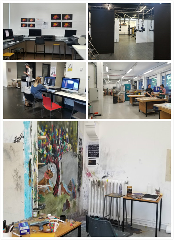曼彻斯特城市大学位于著名的牛津街,和曼彻斯特大学毗邻,距离市中心步行可达。我来到了艺术学院,由教授Dave Griffiths带领,详细参观了各个工作室,很幸运,同学们忙于毕业大秀,可以看到许多正在准备作品的同学。大学目前有三栋艺术学院教学楼,有两座老楼已经有百年历史了,第四栋教学楼还在建设中。