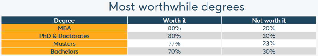 针对大学的回报率情况,Emolument 调查了 1800 名进入职场的毕业生,关于所学的专业、学校和学位是否学有所值,并评选出一些相关榜单。其中,MBA 和 Ph.D 学位的回报率最高,80% 的毕业生认为值得花时间和精力攻读该学位。硕士学位的回报率约为 77%,学士学位的回报率约为 70%。