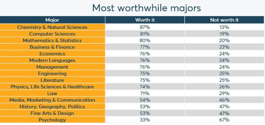 在专业方面,化学 & 自然科学、计算机科学、数学 & 统计学、商业 & 金融、经济学等几大专业被认为回报率最高,大部分毕业生认为该专业学有所值。
