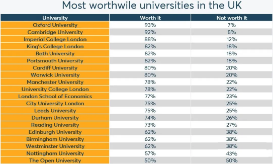 在学校方面,牛津大学和剑桥大学的绝大部分毕业生认为回报率最高。帝国理工学院、伦敦国王学院、巴斯大学等名校的毕业生也普遍认为学有所值。