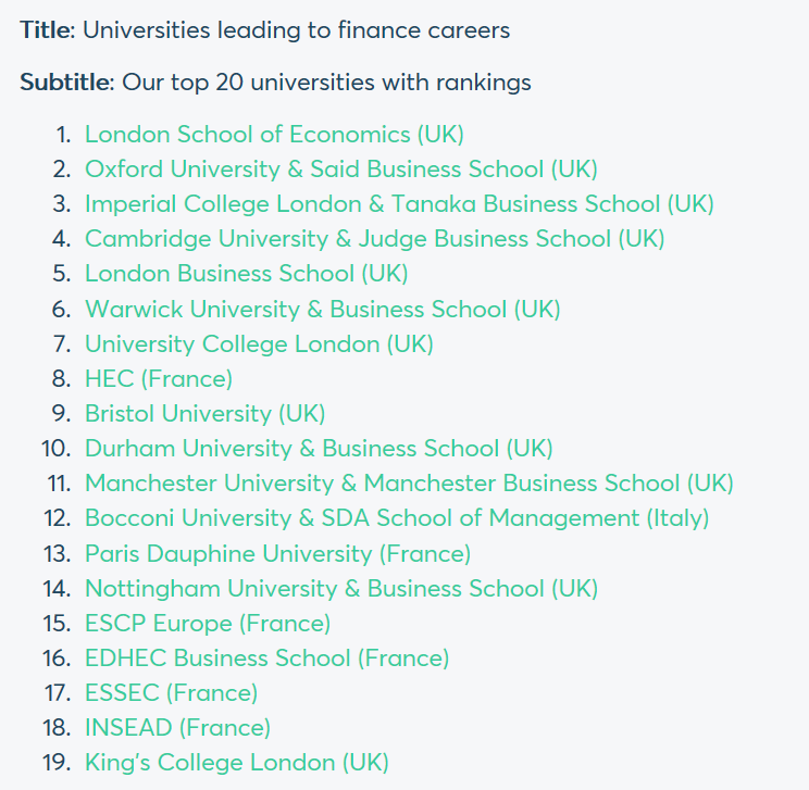 此外,Emolument 还公布了一份在金融行业领先的欧洲商学院名单。这些院校的毕业生更容易进入金融行业,或在金融业获得高薪职位。可以看到,英国大学的商学院在该榜单占据绝对优势。在榜单 Top 10 占了 9 个席位,榜单前五名分别是:伦敦政治经济学院、牛津大学赛德商学院、帝国理工商学院、剑桥大学贾奇商学院、伦敦商学院。